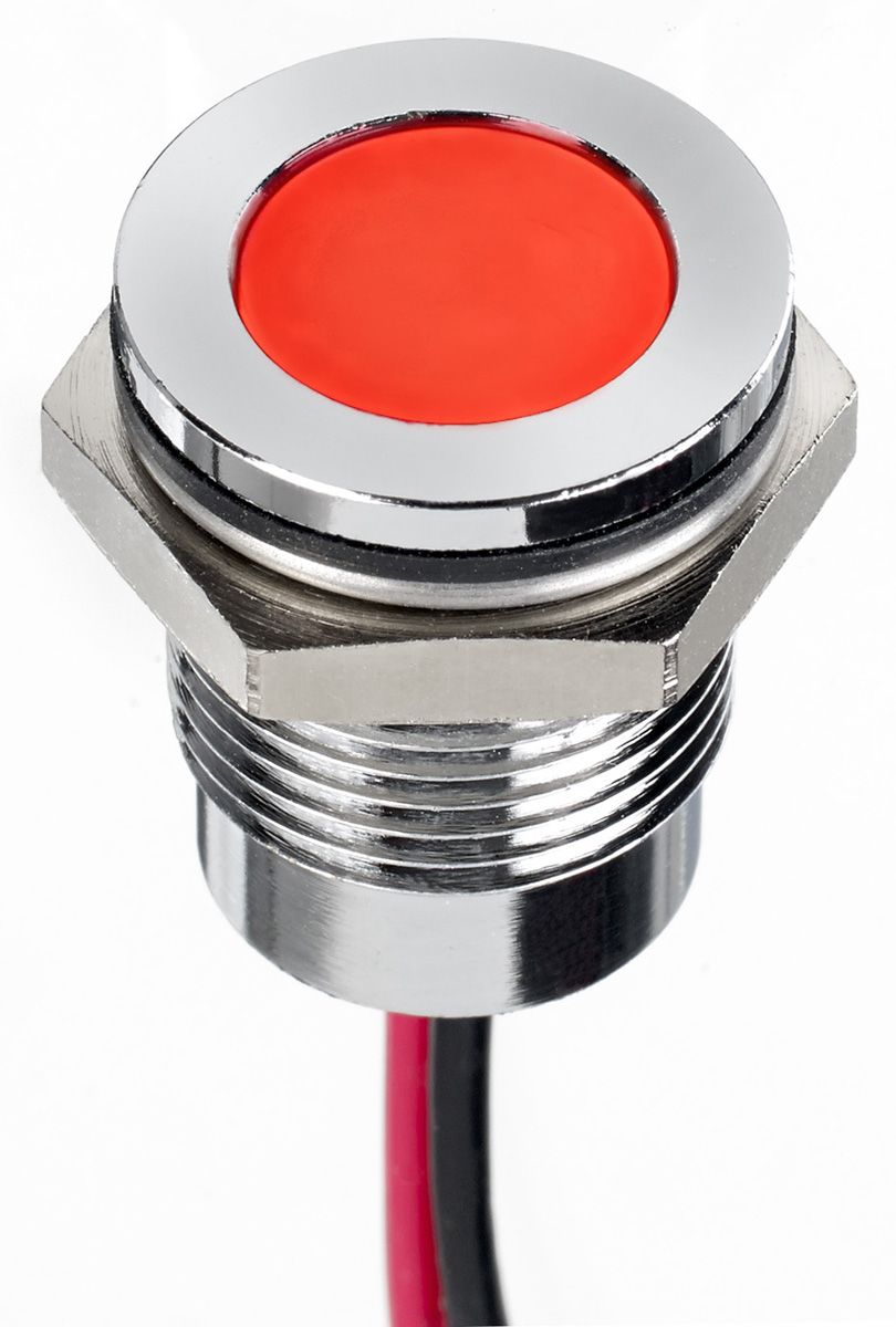 RS Pro range of 14 mm diameter panel mount short body LED indicators with 10 mm coloured diffused LEDs. The indicators are available in bright or black chrome bezel finish with Prominent or flush bezel styles. Voltages in the range are available in 2 V, 12 V and 24 V dc, 110 V ac and 220 V ac. They are rear end potted with epoxy and 200 mm long wires and IP67 panel sealed.
