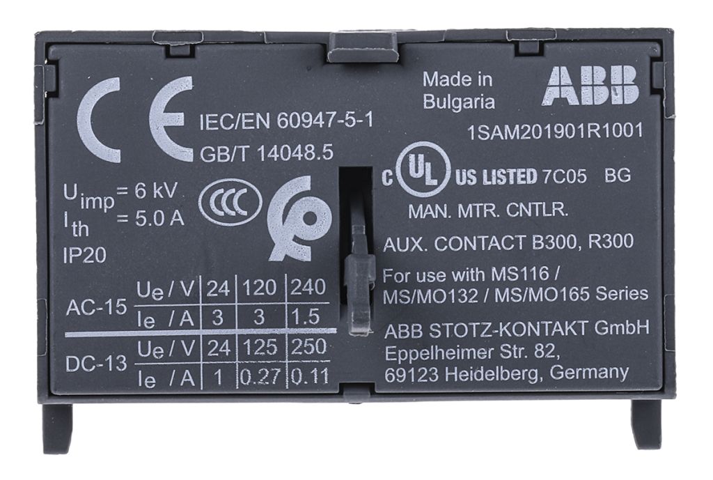 ABB Auxiliary Contact – 1NC + 1NO, 2 Contact, Front Mount, 1 A dc, 3 A ac