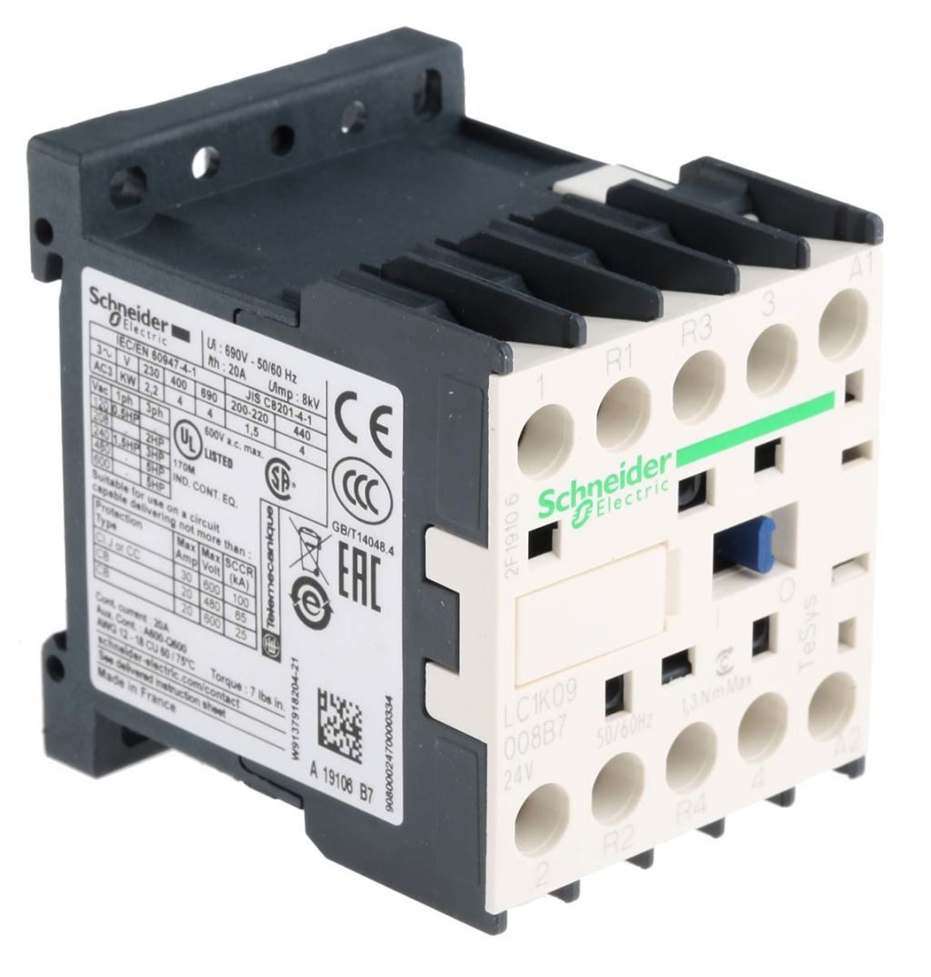 Schneider Electric TeSys K LC1K 4 Pole Contactor – 9 A, 24 V ac Coil, 2NO + 2NC