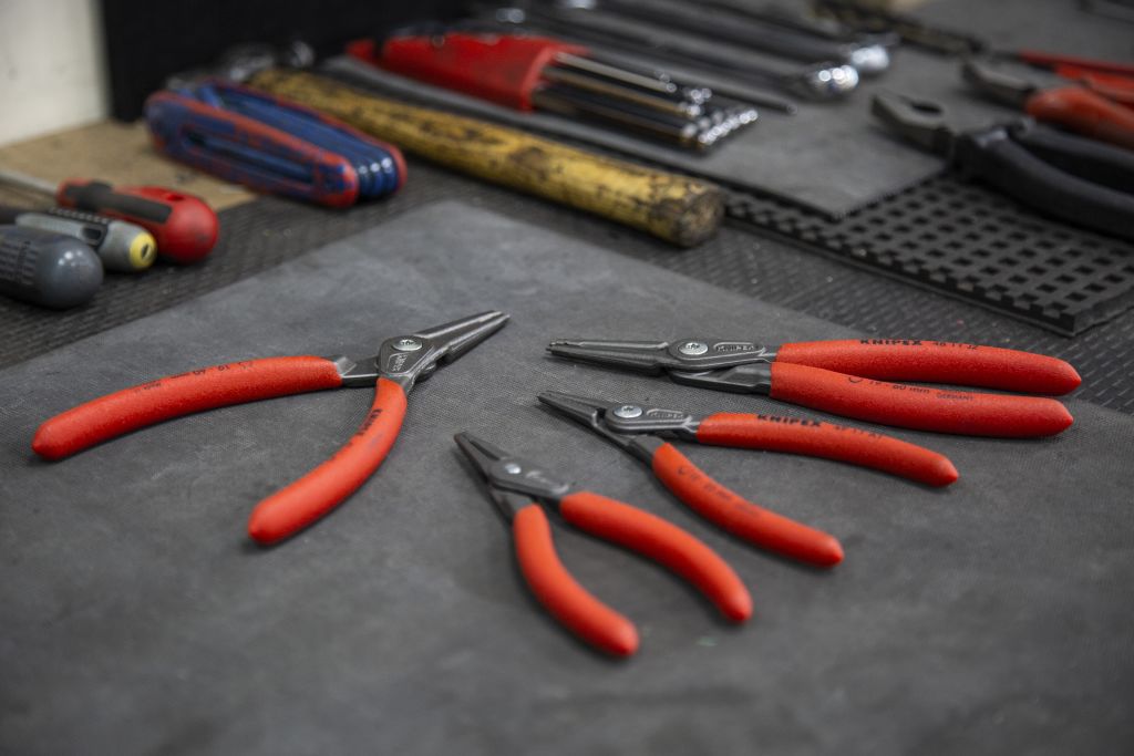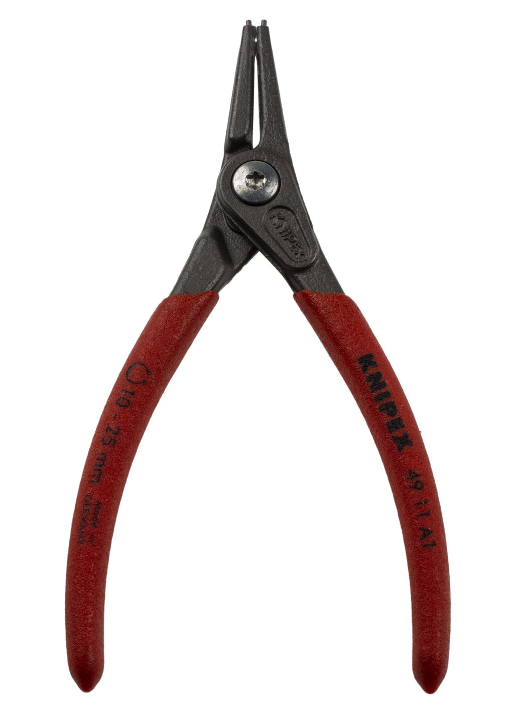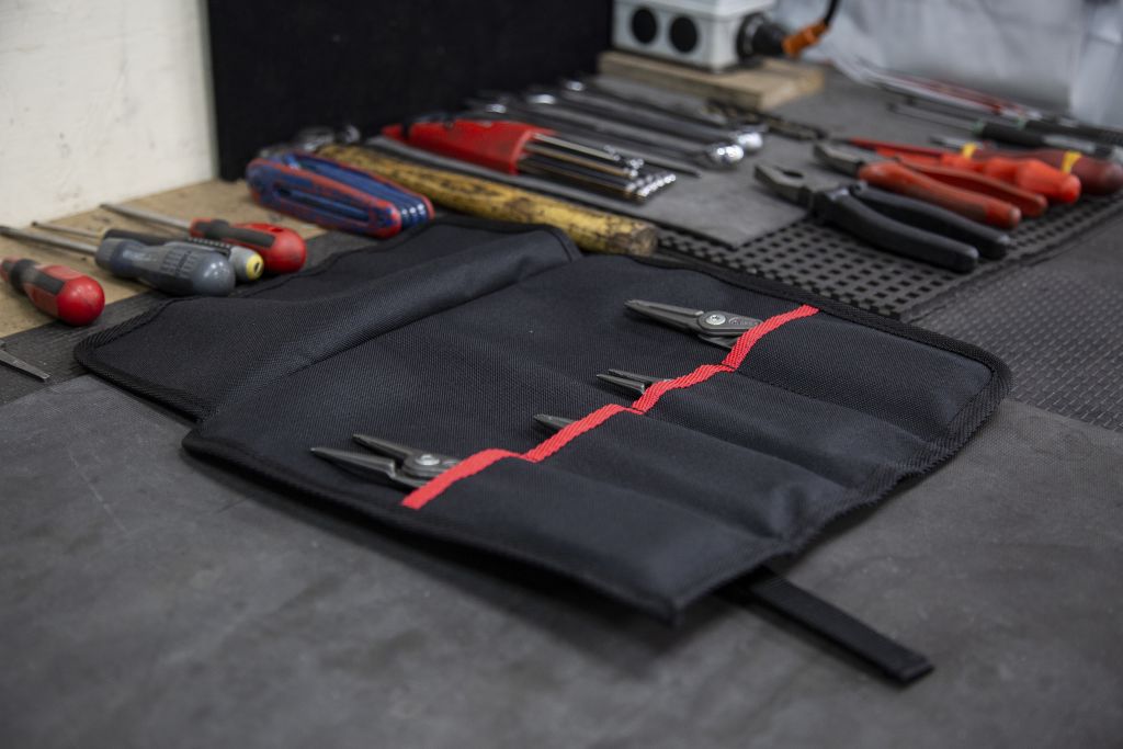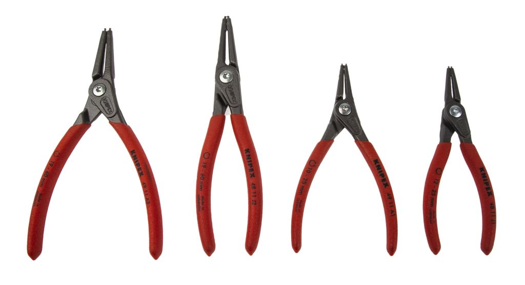 Heavy-duty circlip plier set supplied in hard-wearing polyester fabric tool roll with quick release fastener. The set contains 4 circlip pliers covering the most common circlip sizes:,Internal circlip pliers:, DIN J1 size for bore diameters 12 - 25 mm , DIN J2 size for bore diameters 19 - 60 mm,External circlip pliers, with enclosed return spring:, DIN A1 size for shaft diameters 10 - 25 mm, DIN A2 size for shaft diameters 19 - 60 mm