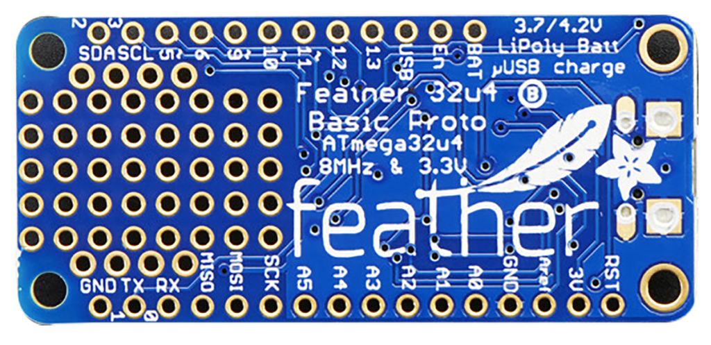 The Feather 32u4 is a range of development boards from Adafruit. They are powered by the Atmel ATmega32u4 microcontroller clocked at 8 MHz with 3.3 V logic. This chip has 32K of flash and 2K of RAM and built-in USB. As a result it has a USB-to-Serial programme and debug capability built in and it can also act like a mouse, keyboard, USB MIDI device.