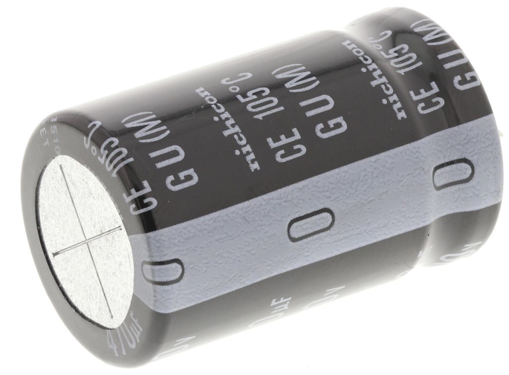 Nichicon GU Series Snap-In Aluminium Electrolytic Capacitors can withstand 3000 hours of rated ripple current application. The snap-in terminal GU Series Aluminium Electrolytic Capacitors from Nichicon offer a large capacitance range with voltages ranging from 16 to 450V. These high performance capacitors have a wide temperature range which is ideal for applications such as uninterruptible power supplies, electric pump motors, and AC servomotors.