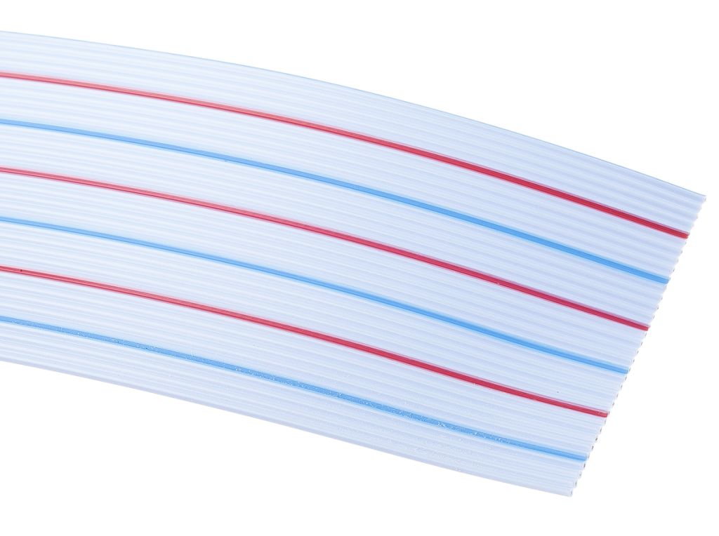 A range of IDC flat and flat to round cables directly suitable for IDC connectors. Parallel stranded tinned copper wire conductors, laminated between layers of blue PVC. Pitch between conductors 1.27 mm. One edge has a redstripe identifying the first conductor. Cable may be split into any number of ways by tearing between conductors. Conductors are 7 stranded (28 awg overall)