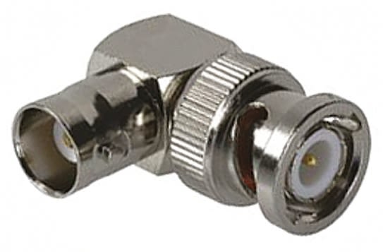 Right angle 50 Ohm BNC jack-plug adapter with a nickel plated body, gold contact and polymethylpentene dielectric