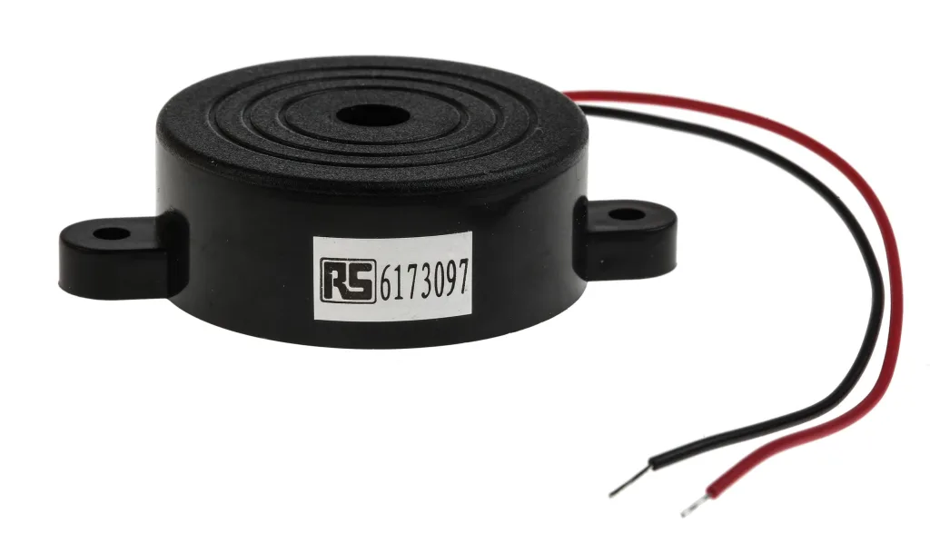 RS Pro 10mA/20VDC Piezo Buzzer with ABS housing with 28AWG flange mounted wire leads, 96dB sound level, 2.8kHz resonant frequency, PCB mount and continuous tone.