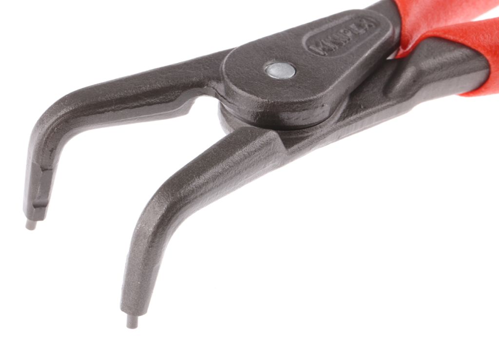 The new KNIPEX precision circlip pliers meet the highest requirements. Positive locked high density spring wire tips offer 10 times longer service life, when compared with conventional circlip pliers, and high stability when loosening tightly fitted circlips. Circlips are held securely thanks to the large contact surfaces of the tips.The large contact areas and the position of the tips ensure fitting without distortion and make it difficult for the circlips to bounce off. The opening spring is protected inside the screw joint.