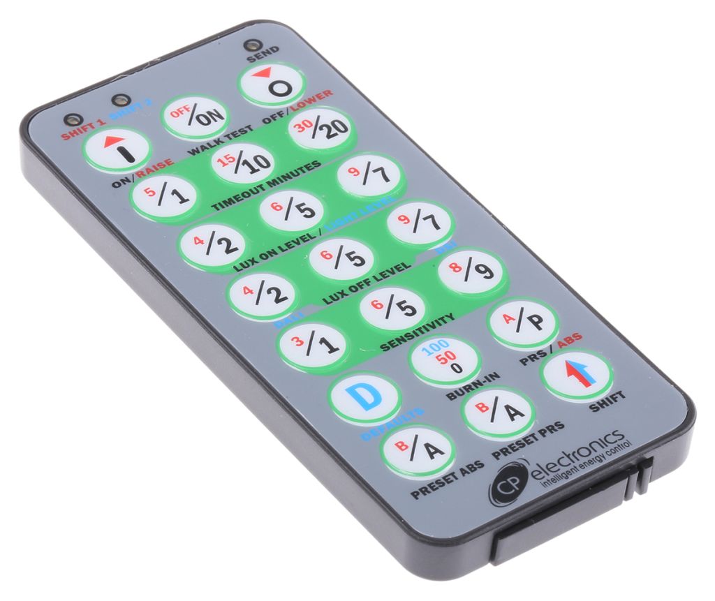 A compact infrared handset used for the operation, configuration and programming of the RS Wireless Lighting Control System products. The handset operates in one of four modes:,User Mode: the default end-user mode used for scene selection, raising/lowering levels, etc.,Configuration Mode: used for setting addresses and general set-up parameters.,Sensing Mode: used for setting parameters on motion detectors.,Scene Mode: for programming scenes on various devices.,Typically, most user control functions require a single button press. Programming is achieved by pressing a number of buttons in a sequence and then transmitting the sequence to a device by pressing the arrow/send button.,This handset has an IR range of 7m.