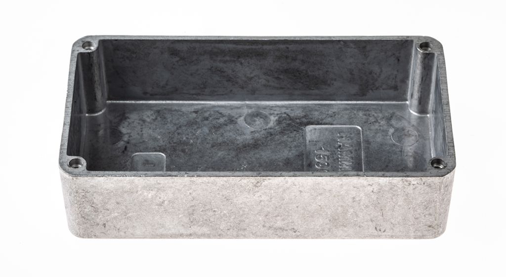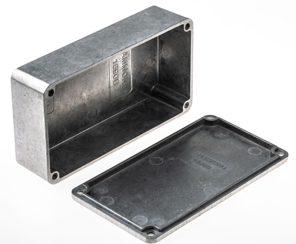 The Hammond 1590 series is a rugged diecast aluminium alloy enclosure suitable for electronic instruments which is tough, yet easy to machine. It has a lap joint construction which provides IP54 protection against dust and splashing water and also provides improved EMI/RFI shielding. The enclosure, also known as a Stomp Box, is available in a rectangular, trapezoidal or octagonal design.