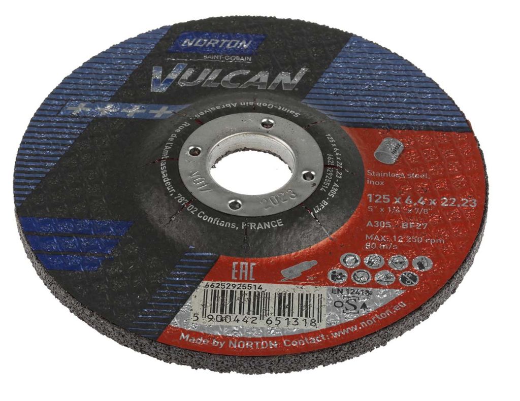 | Product description | Norton Grinding Disc Aluminium Oxide Grinding Disc, 125mm x 6.4mm Thick, P30 Grit, Vulcan, 5 in pack |