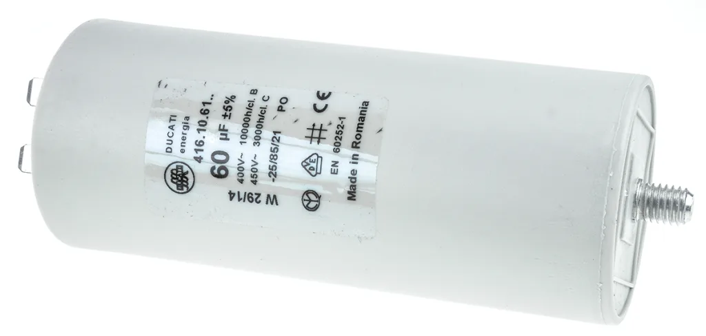 | Product description | Ducati Energia 4.16.10 Polypropylene Film Capacitor, 450V ac, ±5%, 60μF, Stud Mount |