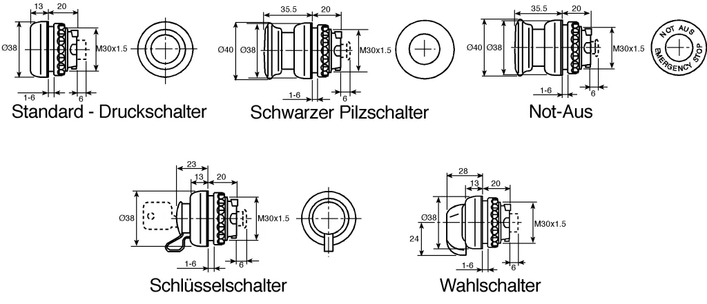 Panel mounting, with a wide range of switch contact arrangements and elements including; selector switches, key switches, standard pushbuttons and an emergency stop pushbutton. The actuators and lens units require a 30.5mm mounting hole. Ingress protection is to IP66 and they are component-approved in their own right. Switch and lamp modules include three metres of encapsulated cable. Switch modules include a wipe clean action and are rated up to 230Vac/16A (circuit type AC-12). The N/C contact has a positive break action.,The electronic circuitry of each lamp module self configures to allow the lamps to be used over a wide range of ac and dc voltages.,A simple cam arrangement on the modules provides a rapid method for the fitting of the actuators.