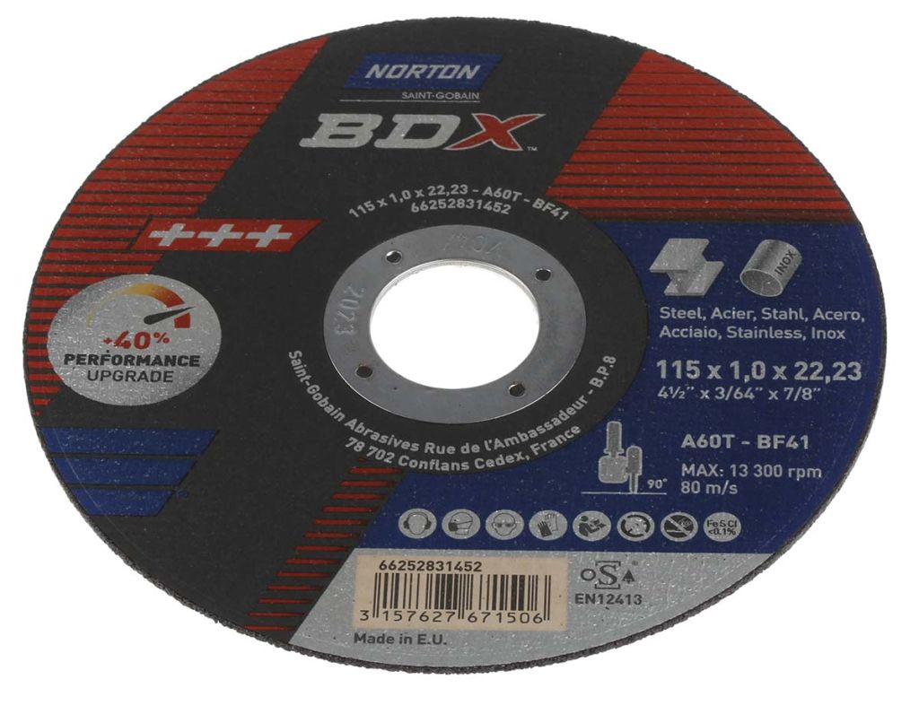 | Product description | Norton Cutting Disc Aluminium Oxide Cutting Disc, 115mm x 1mm Thick, P60 Grit, BDX, 5 in pack |