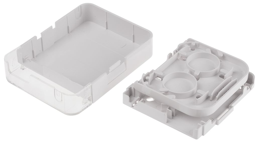 From the trusted RS Pro brand, a range of robust ABS enclosures for fibre to the home installation and management. The white ABS customer outlet boxes in this series come in a range of fibre counts, cable entry points and outlet options. All the customer outlet boxes have integrated fibre management and integrated shutters for protection and safety.