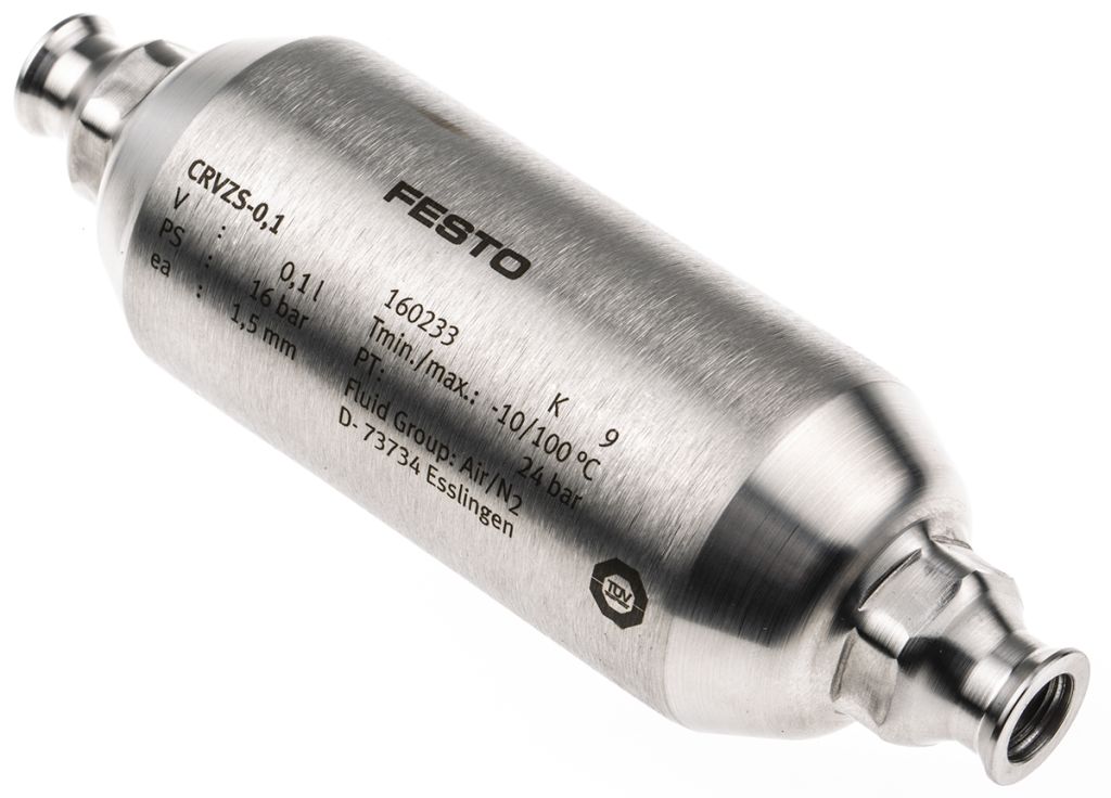 Festo CRVZS series air reservoirs provide an effective solution for smoothing air pressure fluctuations within a compressed air systems. The air tanks can also operate as an accumulator when a large surge of air is required. They can also be used in collaboration with pneumatic control valves to create time delays for pressure build-up in the system.