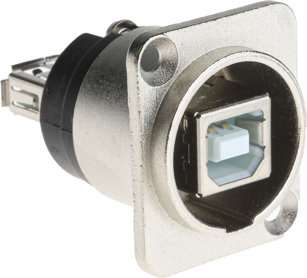 A range of RS Pro USB gender changer sockets in rugged XLR housings. The USB connectors convert from USB 2 A to B or USB 2 B to A. Designed to accommodate USB2 data feeds into professional broadcasting, audio and lighting applications. Housings are constructed from nickel plated zinc and are available in self-coloured or black options. Suitable for front or rear panel mounting.