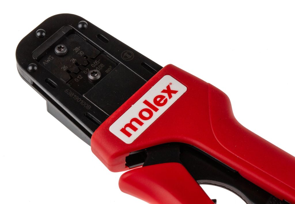 From Molex a PremiumGrade manual crimping tool made from high-quality materials and designed to crimp to a high specification. This PremiumGrade crimp tool has been tested to a minimum of 50000 cycles. If the tool is looked after and maintained it produces crimps to the highest specification during this life span. This crimping tool consists of two ergonomically designed soft grip handles with an adjustable preload force, ratchet mechanism, die assembly and terminal locator.
