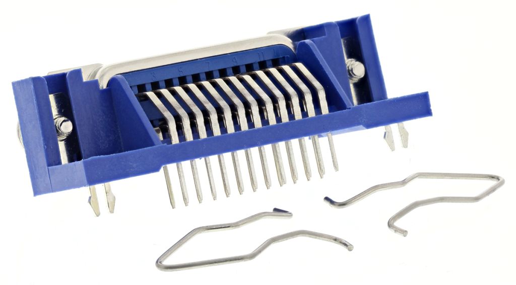 Right-angle mounted socket with tin-plated solder pin terminations. Supplied complete with spring clips for retention of RS cable mounting plugs.