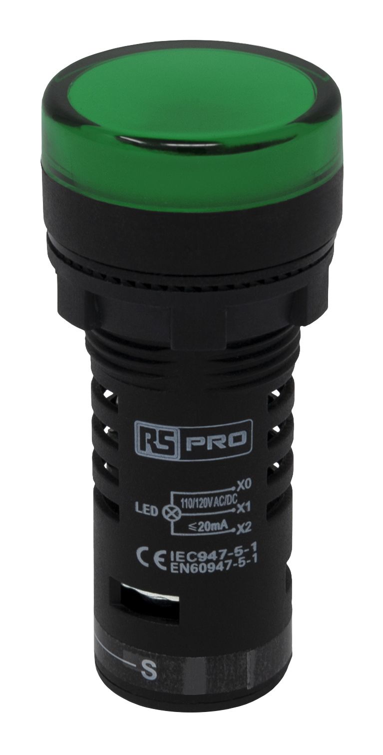 RS PRO, Panel Mount Green LED Pilot Light Complete With Test Circuit, 22mm Cutout, IP65, Round, 110V ac/dc
