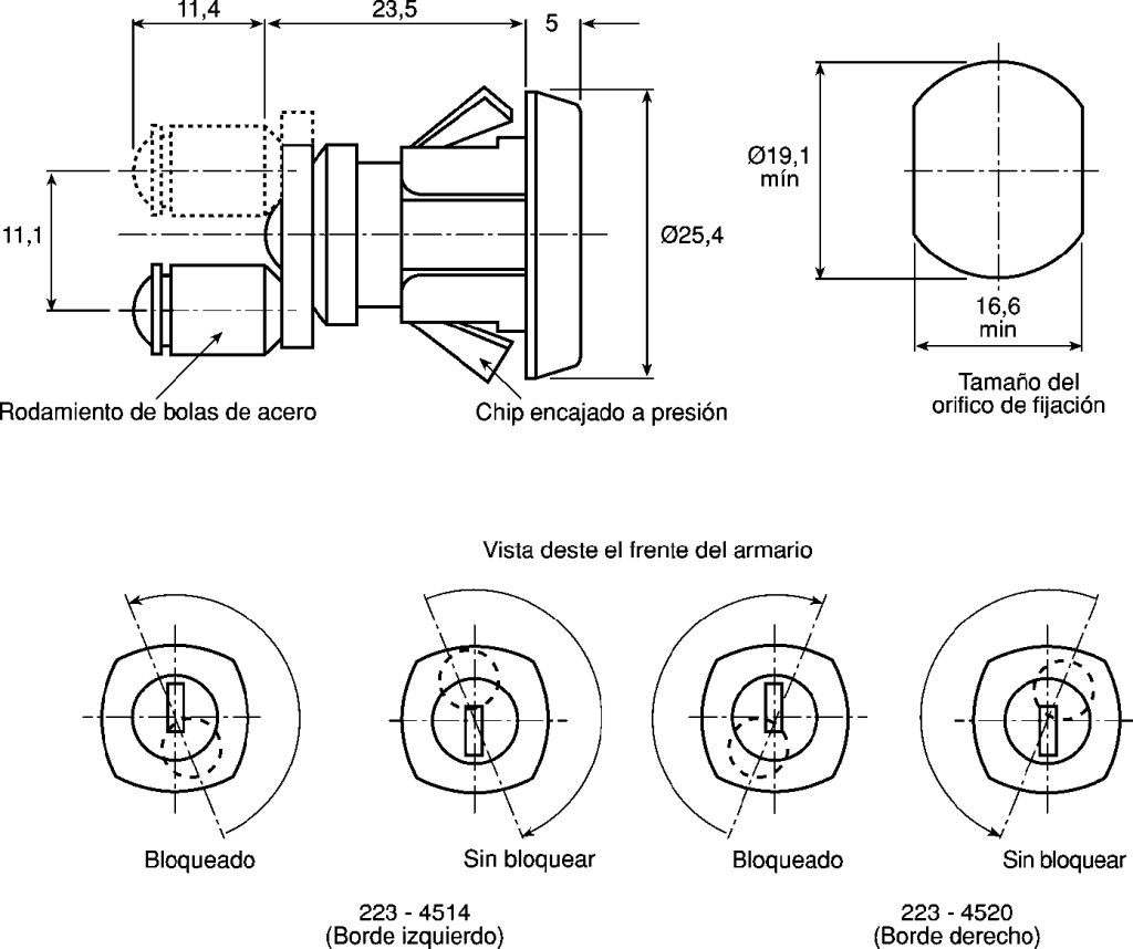 By turning the key 180°, the roller cam on the back of the lock moves the cabinet locking bar downwards