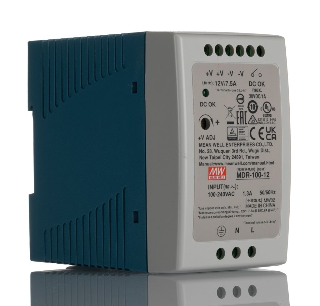 | Product description | Mean Well MDR Switch Mode DIN Rail Power Supply 85 → 264V ac Input, 12V dc Output, 7.5A 100W |