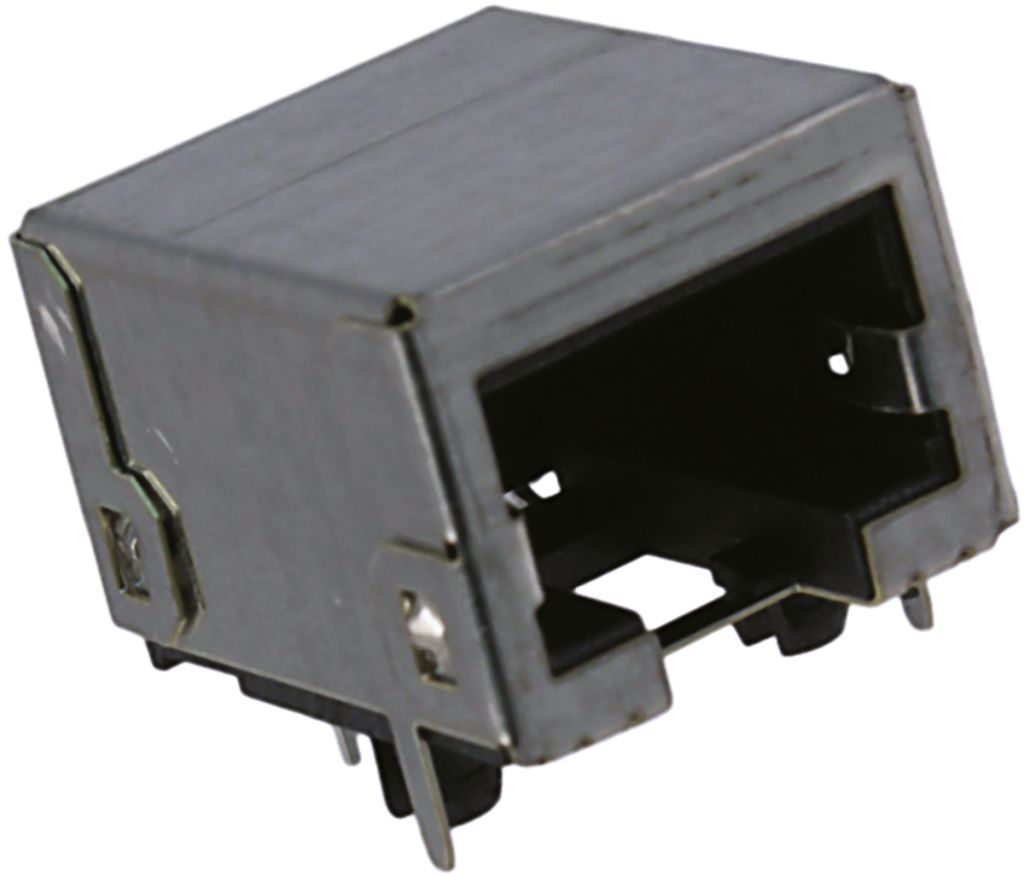 85505 series Cat 5e right angle through hole mount full shielded RJ45 high speed modular jack with a low profile height of 13mm and a version A style footprint. This Cat 5e RJ45 modular jack has external shielding for advanced EMI/RFI protection and PCB location and retention. For mating RJ45 modular plugs see 95043 and 85568 series, stock number 386-2772 typically