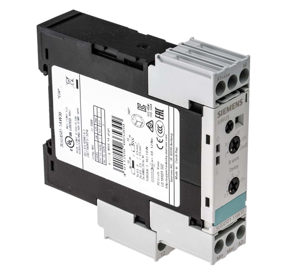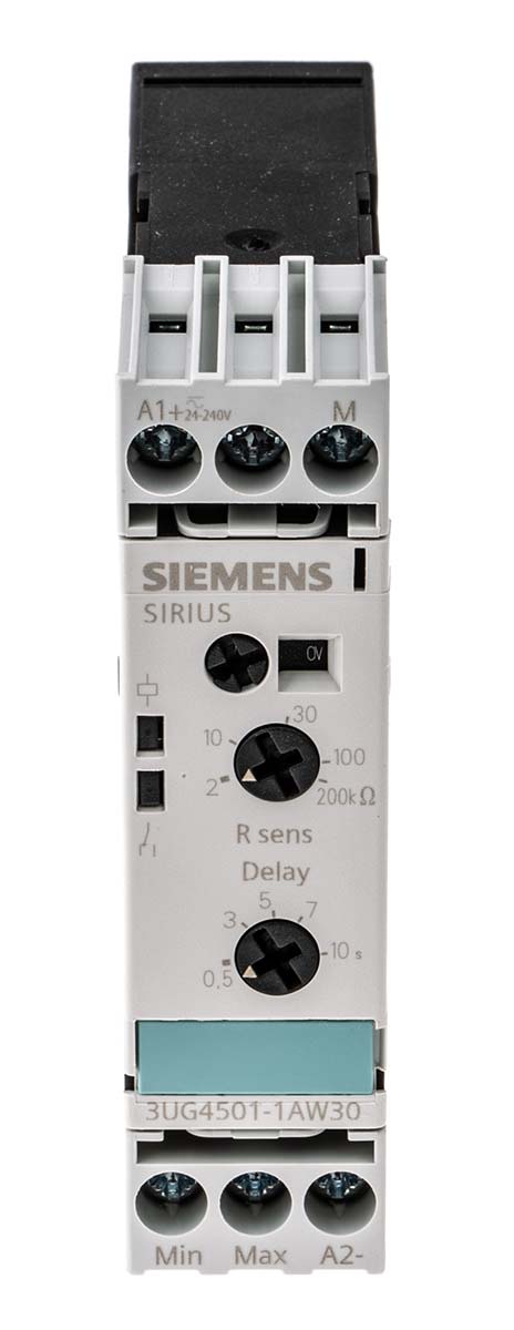 Siemens 3UG range of level monitoring relays for conductive liquids with screw terminals. To be used with 2 or 3 pole sensors. Comprising of 1 yellow LED for indicating the relay state and 1 green LED for indicating the applied control supply voltage.