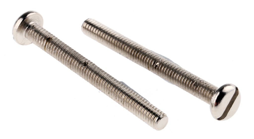 From RS PRO a high-quality slotted pan head machine screw with a metric thread. This pan head machine screw is made from high-quality nickel plated brass which has resistance to corrosion and moisture making it ideal for exterior use. The nickel plating on this screw prevents tarnishing and provides a hardened surface. These screws are also known as switch box screws as they are commonly used as fasteners for electrical switches and sockets.