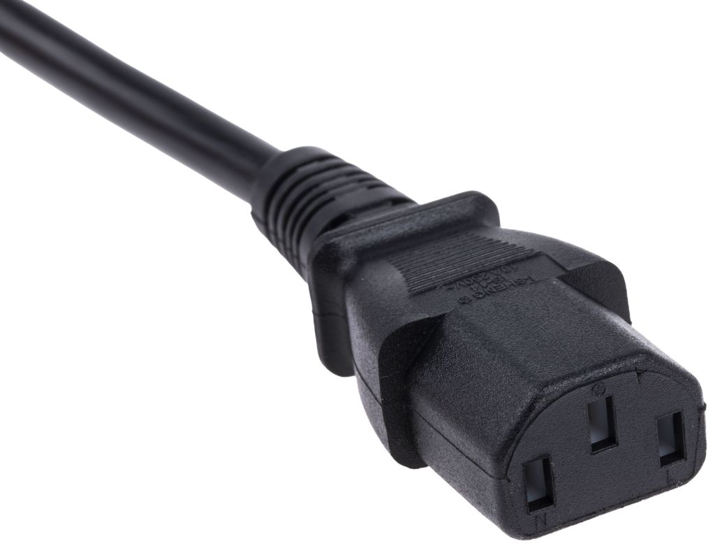 This power cord is terminated with a fully moulded IEC C13 plug which is used to connect the cable to an appliance which has an IEC C14 inlet. C13 and C14 connectors have 3 pins, a rated current of 10 A and a maximum temperature rating of 70°C, and is sometimes referred to as ’cold connectors’. IEC connectors conform to IEC-60320 specifications laid down by the IEC (International Electrotechnical Commission) to ensure the connector meets common global design standards