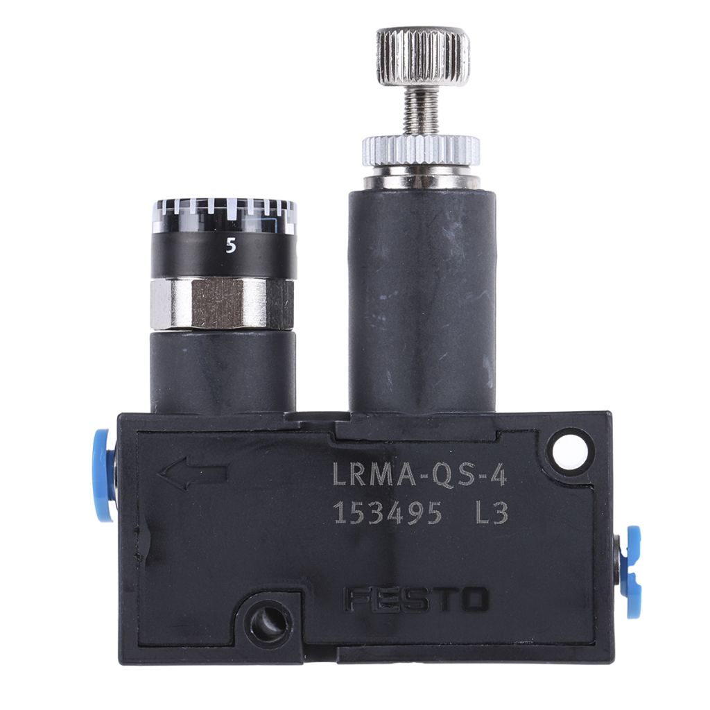 Festo LRMA series pressure regulator maintains a constant output pressure on the secondary side independent of pressure fluctuations on the primary side and air consumption. The primary pressure at the screw-in thread is reduced when air is exhausted from the QS push in connector. The LRMA series features a pressure gauge to give visible feedback from the unit.