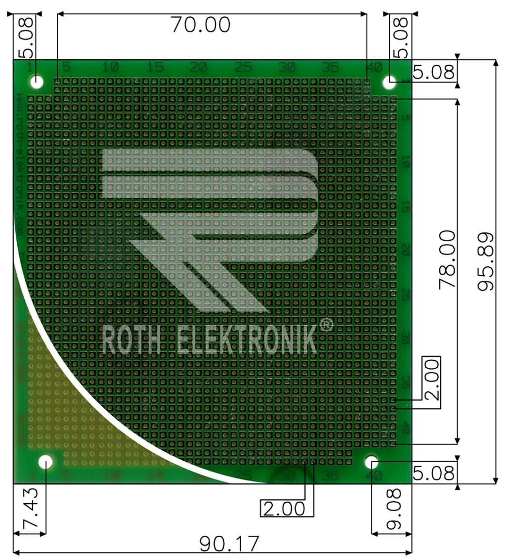 | Product description | Roth Elektronik Single Sided Matrix Board FR4 With 44 x 42 1mm Holes, 2 x 2mm Pitch, 95.89 x 90.17 x 1.5mm |