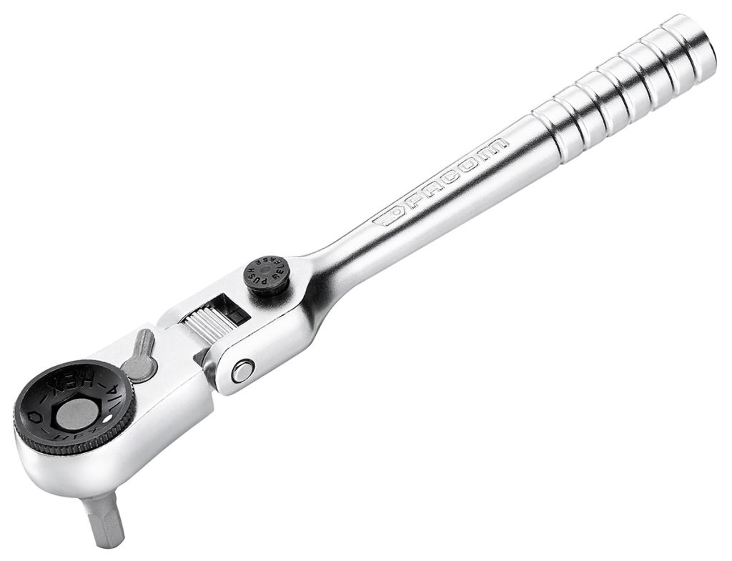 Introducing a flexible head compact 1/4 inch ratchet from Facom. Professionally made ratchet come with excellent 180° tilt capability and position lock at a push of a button. Together with the magnetic extension bar enables you to solve problems of access or to be used as a T-handle for more power when tightening or loosening.