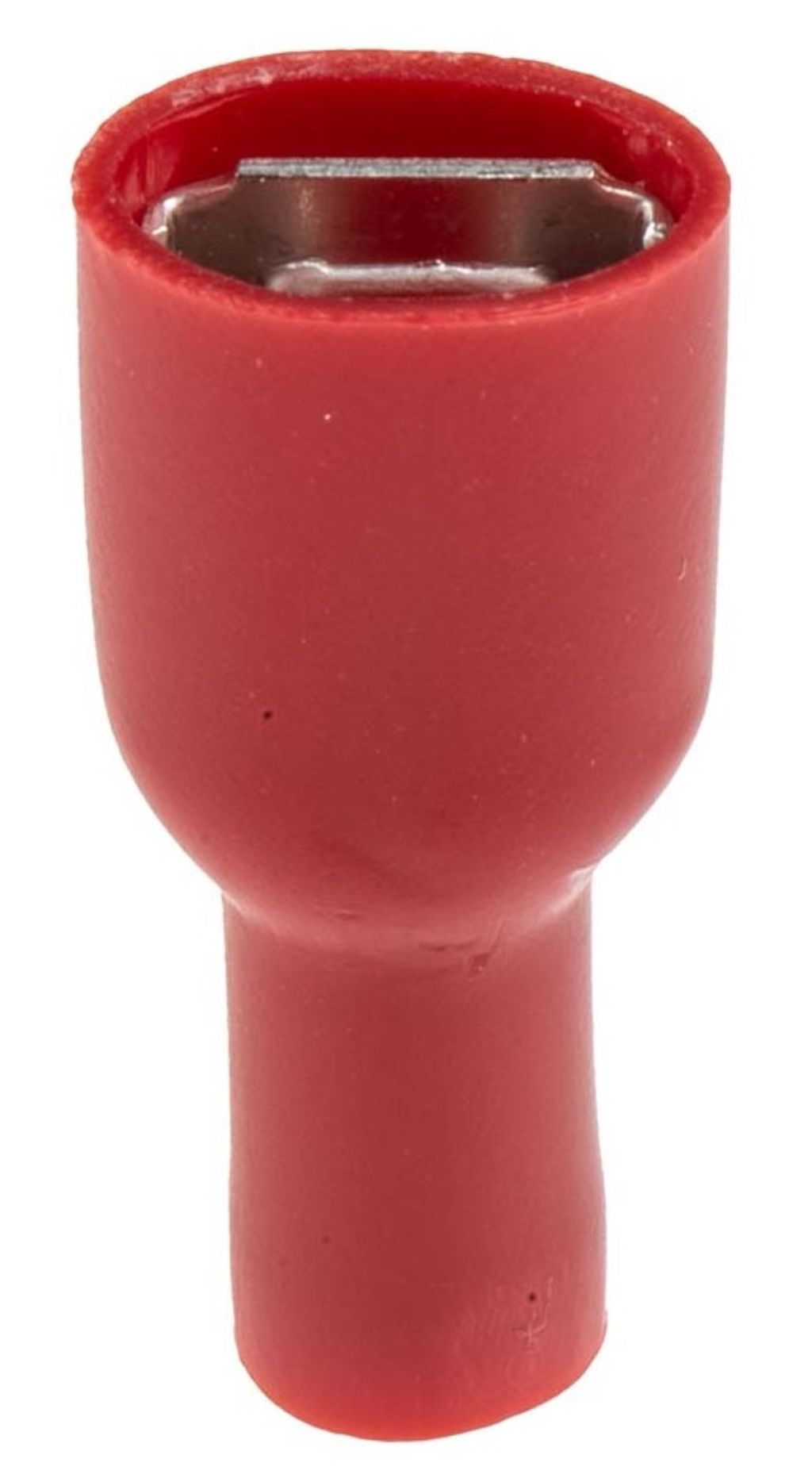 From RS PRO a high-quality fully insulated crimp receptacle terminal sometimes known as a female quick disconnect. Female crimp receptacles are a type of electrical wiring connector which, when mated with a male tab connector (or male quick disconnect), provide a fast and reliable interconnect between two wires. The body of the connector is made from tin plated brass and features an additional internal copper sleeve. This copper sleeve strengthens the barrel and provides a robust and secure crimp. The sleeve also protects the wire against stress and high vibration. The main feature of this female receptacle is the insulation which covers the entire length of the connector body. This insulation provides protection against electric shock and acts as a ’mini’ enclosure to protect the connection from dirt, grease, liquids and other contaminants when mated.