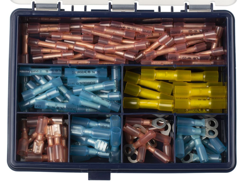 This Duraseal terminal and splice service and repair kit contains a range of insulated Duraseal crimp terminals, with a wire size range of 0.5mm to 6mm2, coloured blue, red and yellow. Storage for the Duraseal crimp terminal and splice service and repair kit comes in a sturdy plastic case, with convenient compartments and a locking lid.