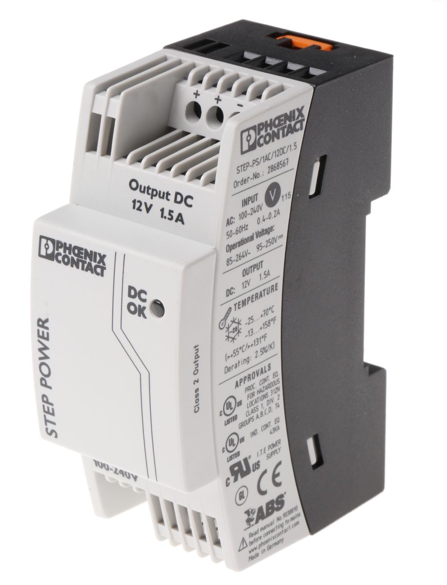 | Product description | Phoenix Contact STEP-PS/1AC/12DC/1.5 Switch Mode DIN Rail Power Supply 85 → 264V ac Input, 12V dc Output, 1.5A |