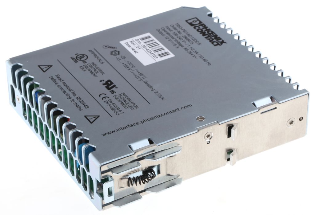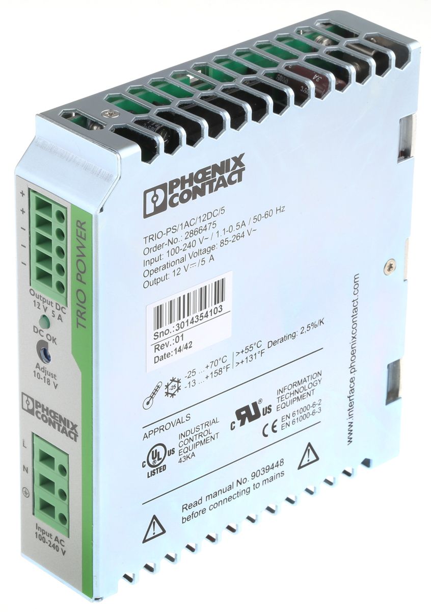 | Product description | Phoenix Contact TRIO-PS/1AC/12DC/5 Switch Mode DIN Rail Power Supply 85 → 264V ac Input, 12V dc Output, 5A 60W |